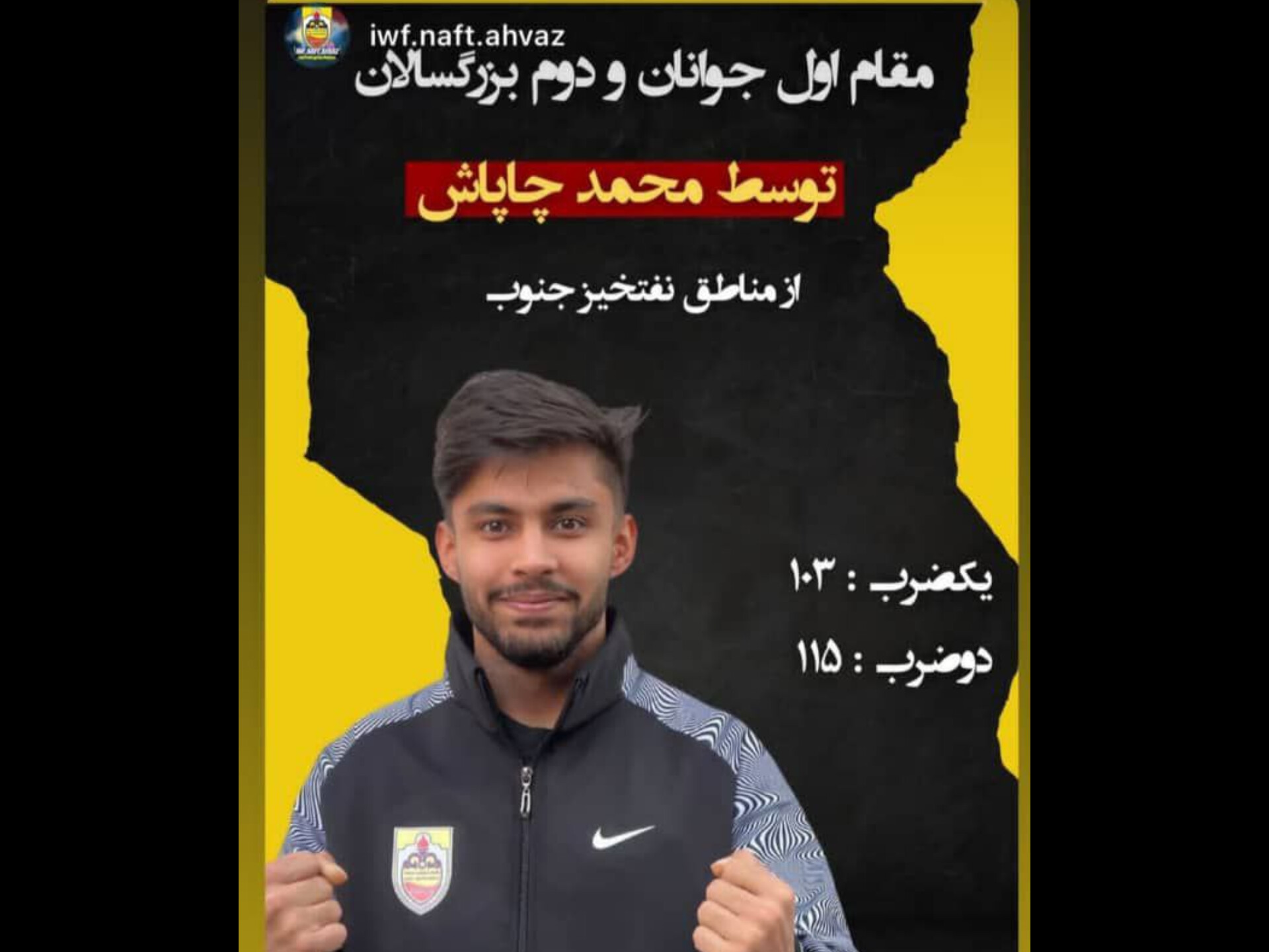 ۱- محمد چاپاش دردسته ۵۵ کیلو در یکضرب با۱۰۳ کیلو گرم مقام اول جوانان و بزرگسالان و در دو ضرب با۱۱۵ کیلو گرم مقام اول جوانان و دوم بزرگسالان و درمجموع با۲۱۸ کیلو مقام اول جوانان و دوم بزگسالان را کسب نمود.