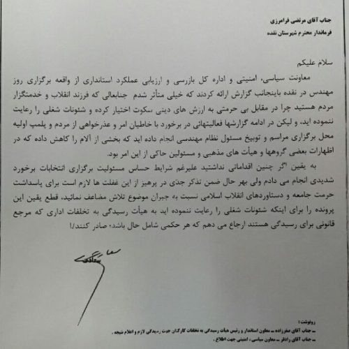 به اطلاع مردم شریف استان آذربایجان غربی می رساند، در چند روز گذشته اتفاق ناگواری در شهرستان نقده در جشن روز مهندس رخ داد که باعث ناراحتی مسئولین ارشد استان و مردم شهید پرور گردید که در جهت تنویر افکار عمومی و اعتقاد به اینکه دانستن حق مردم است عین نامه توبیخ فرماندار نقده توسط استاندار آذربایجان غربی که در مورخه ۲۳ اسفند صادر گردیده منتشر می گردد. /ایسنا