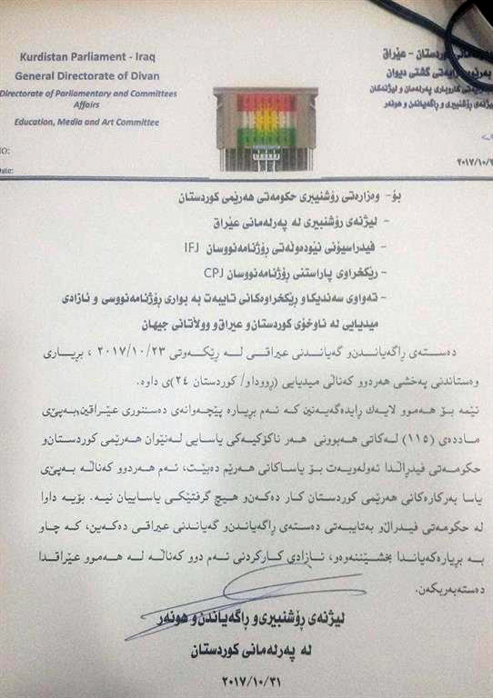 لێژنهی رۆشنبیری و راگهیاندن و هونهر له پهرلهمانی کوردستان، له راگهیهندراوێکدا، که ئاراستهی ههریهک له وهزارهتی رۆشنبیری، لێژنهی رۆشنبیری پهرلهمانی عێراق، فیدراسیۆنی نێودهوڵهتی رۆژنامهنووسان و لێژنهی پاراستنی رۆژنامهنووسان و تهواوی رێکخراو و سهندیکا و کۆمهڵهکانی تایبهت به رۆژنامهوانی کردووه و تێیدا، بڕیاری راگرتنی پهخشی کهناڵه کوردییهکان به نادهستووری وهسف دهکات.
